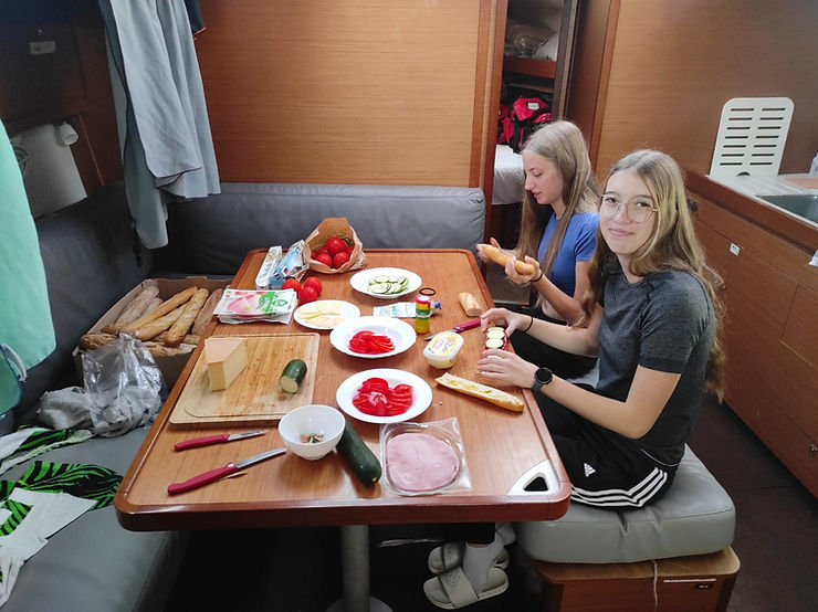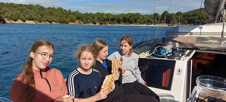 Le matin les polo 《chon》on déjeuner,préparez par Méline et un nains 《Julia》.Nous larguons les amarres pour prendre la mer, après 2h moteur car le vent n’était pas au rendez-vous. Nous avons mouillé a la baie des languoustier, sertain se sont baigner on a vue des méduses Julia en a attraper une, sont nom Jeraldine .Nathan à pêcher un poisson, Julia a fait un bisous au poisson. Nous sommes partie pour aller à la baie d’alycastre,cette fois le vent était de la partie donc nous avons hissé la grand voile et déroulé le foc d’ailleurs le doc n’est pas compétitif.Nous avons viré de bord pour venir à la baie, nous avons pris 1h30 et somme arrivé 1705.Se soir deux personnes nous prépare des brochette de bœuf kebab leurs nom Margot et Nora.Lors du sommeil il y aura des vagues.
