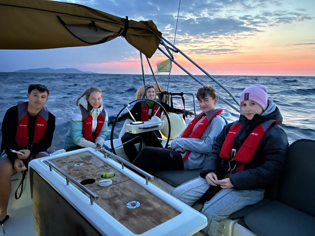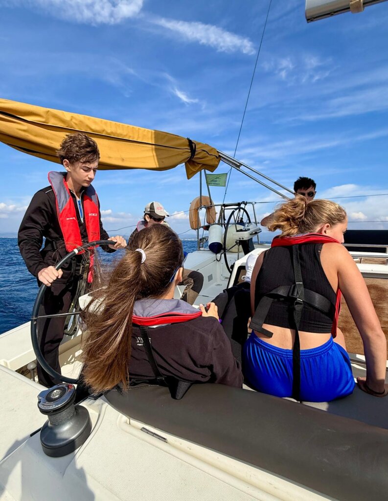 « Aujourd’hui, nous nous sommes réveillés à 8h, les garçons ont directement sautés dans l’eau. Puis, nous avons déjeuné. Manon et Noa on prépare la salade de riz. Pendant ce temps, Jane, Elsa, Arnaud et Éric ont joué aux cartes pendant que les garçons faisaient des tours sur l’annexe. Nous avons vu une pieuvre 🐙. Puis nous sommes partis. Nous avons changé de chemin car la météo était idéale. Vers midi, nous avons eu notre deuxième test d’« homme à la mer » => une boué! Puis nous avons mangé le dîner. Remercie Malika (maman de Manon) et Alexandra et Babette (maman et grand-maman de Jane) pour leurs délicieuses confiseries! Notre chère capitaine Elsa a très bien barré. Pendant ce temps, Helder, Manon, Jane et Alizée se sont reposés à l’avant du voilier. Augustin et Lukas ont fait les géographes. Nous nous dirigions vers le port Lavandoux. C’était notre premier amarrage au ponton. Puis nous avons enfin eu notre douche avec eau chaude. Ensuite nous avons fait un tour dans les petits magasins comme une librairie. Après nous avons partagé un apéro en compagnie de notre accompagnateur Gaetán. Elsa, Helder, Manon et Augustin ont préparé le souper.