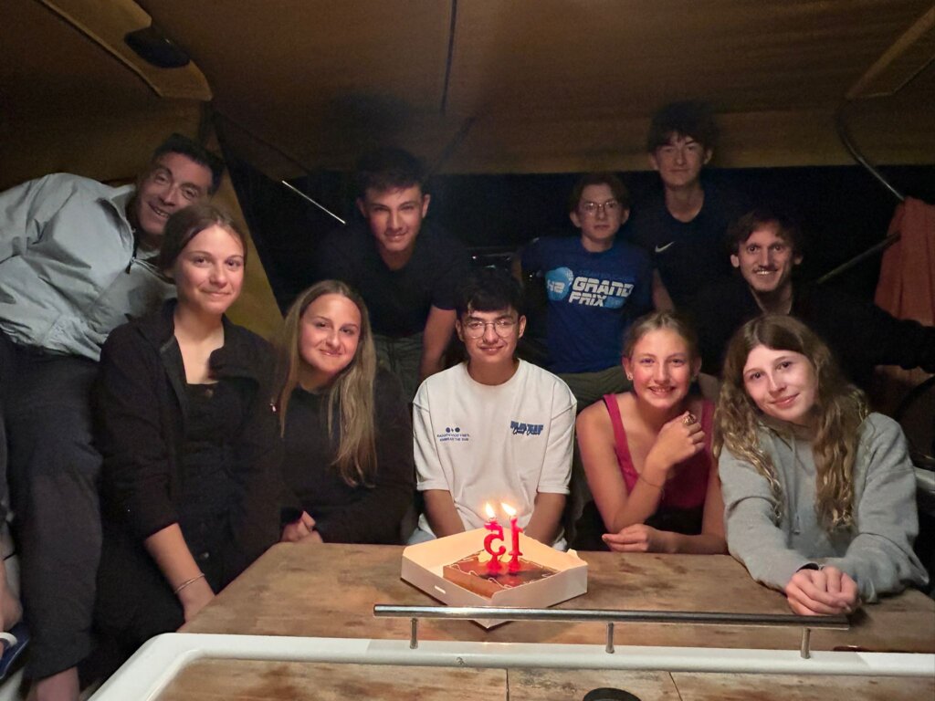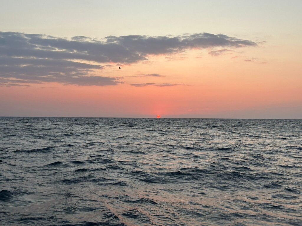 Aujourd’hui, nous nous sommes levés à l’aube (vers 5h30) et sommes partis en mer à 6h. Pas tout évident pour ne skipper qui ne voyait rien. Il nous a montré comment se repérer uniquement avec les cartes et instruments de bord. Nous avons pu admirer le lever du soleil en pleine mer, c’était magnifique!