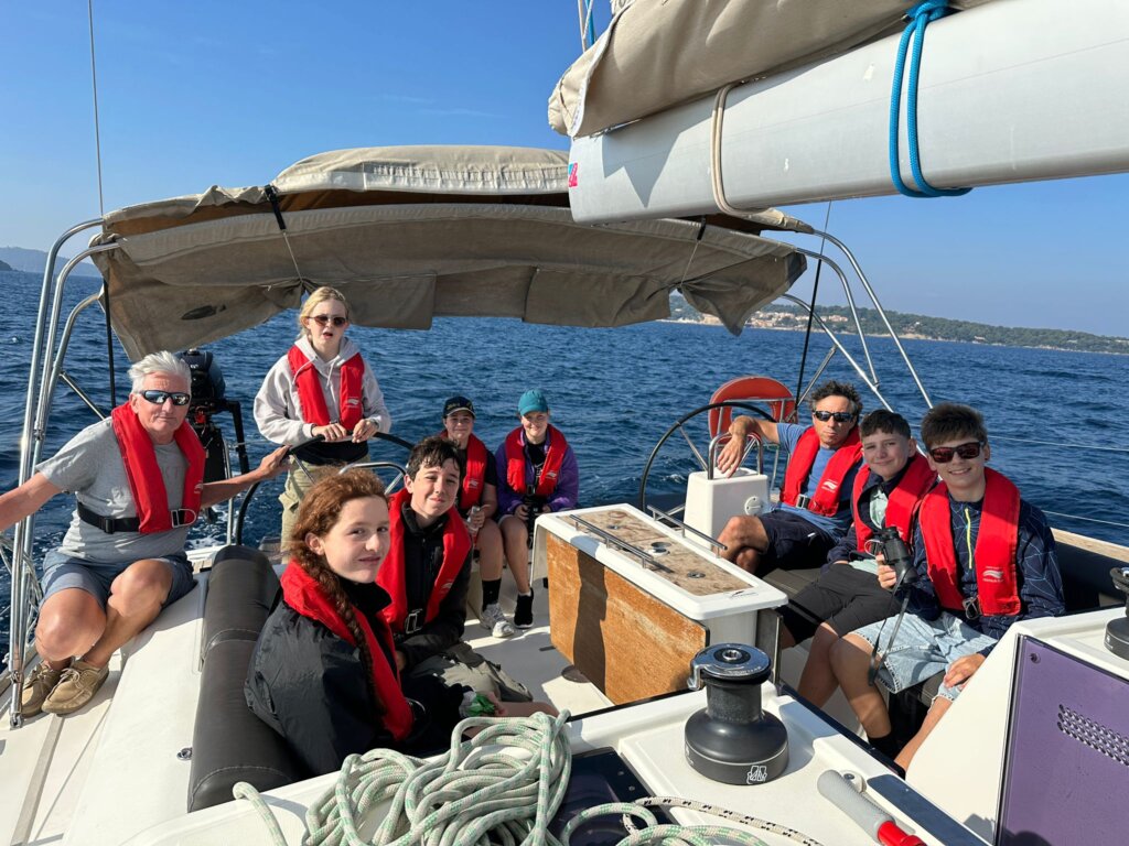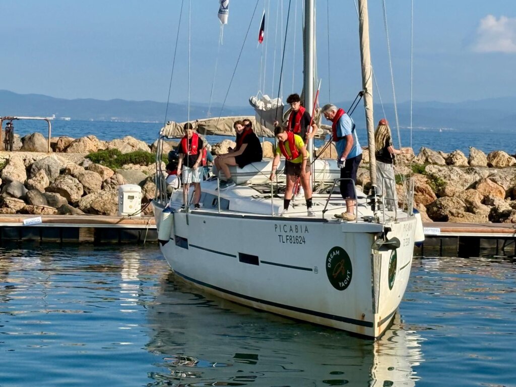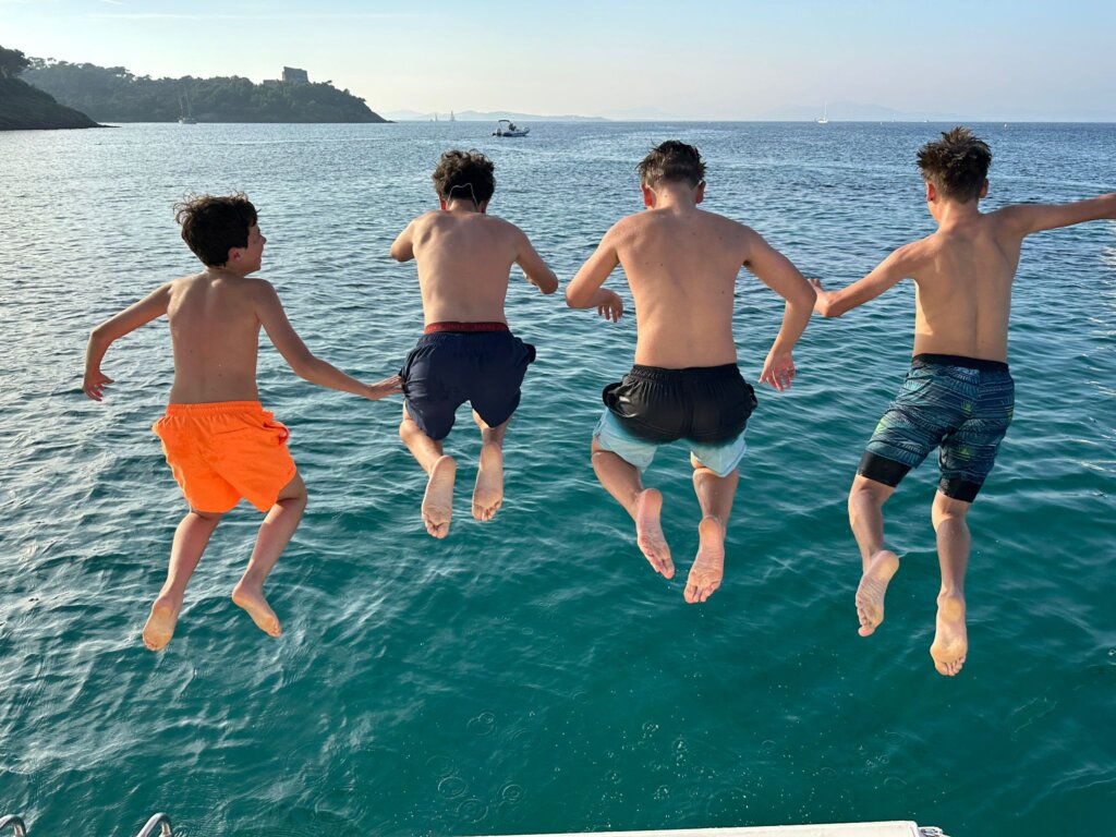 Aujourd’hui, nous avons beaucoup navigués. Mais tout d’abord nous nous sommes baignés avec les poissons 🐟. Ensuite nos poissons nous avons levé l’ancre et sommes partis. Il y avait du bon vent et donc nous avons pu tout faire à la voile ! Finalement, nous voici au port et nous avons pu visiter le Lavandou. Ce soir nous sommes allés prendre l’apéro sur un autre bateau et on a dansé! À demain.