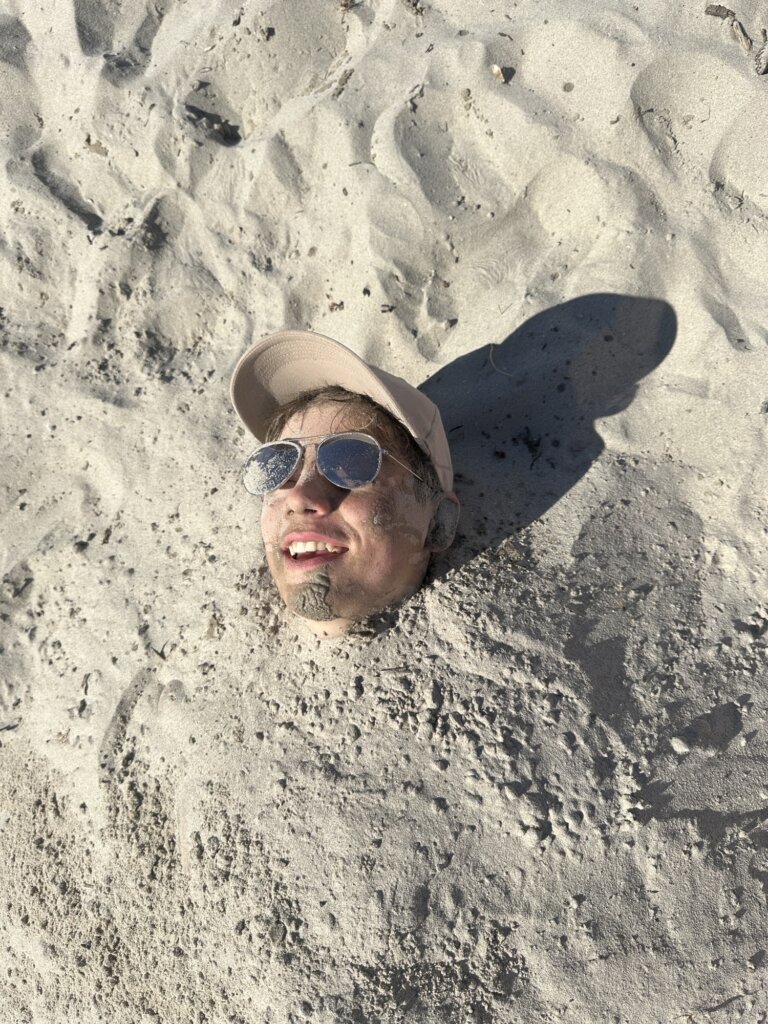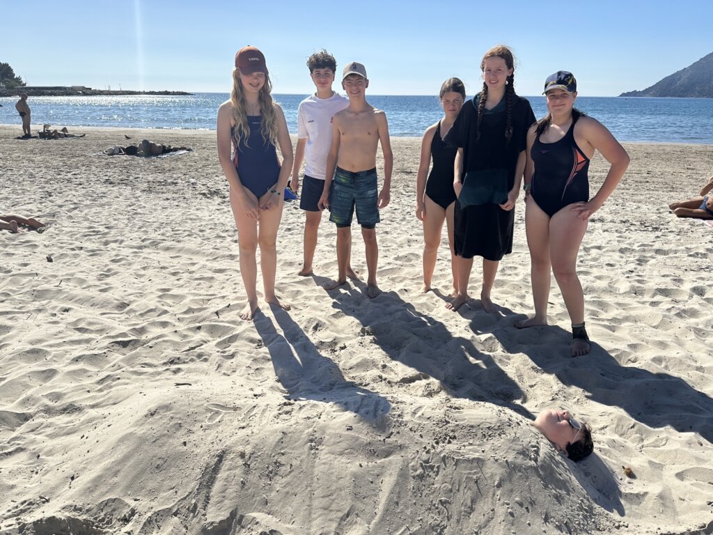 C’est aujourd’hui qu’a commencé notre aventure. Nous nous sommes réunis sur le parking de l’autoroute de l’aire de la Joue des Ponts. Nous y avons pris le bus, quelques-uns nous ont accosté dans le bus et nous ont demandé sur une échelle de 1 à 10,  notre motivation, mais vu qu’on était filmés, on a répondu 12. On a presque tous mal dormi, sauf Théophile qui ronflait tout le trajet. Nous sommes arrivés aux alentours de 9 heures, on a déchargé le bus qui était plus chargé qu’un sherpa sur l’Everest. On est parti en direction de la plage, on s’est battu avec du sable et on a fait des trous, super profond, Théophile est tombé dedans. On a enterré Tilian et Théophile sans leur consentement.