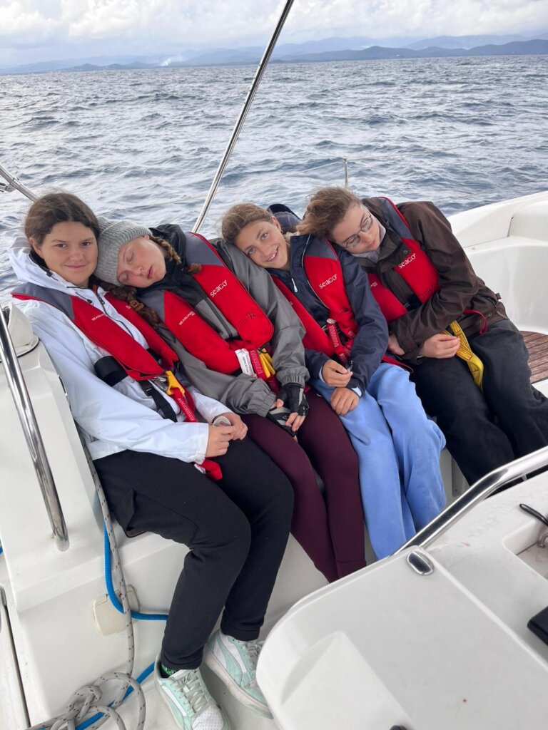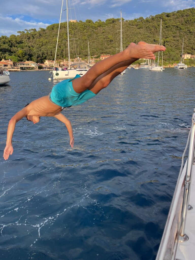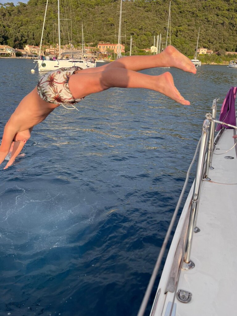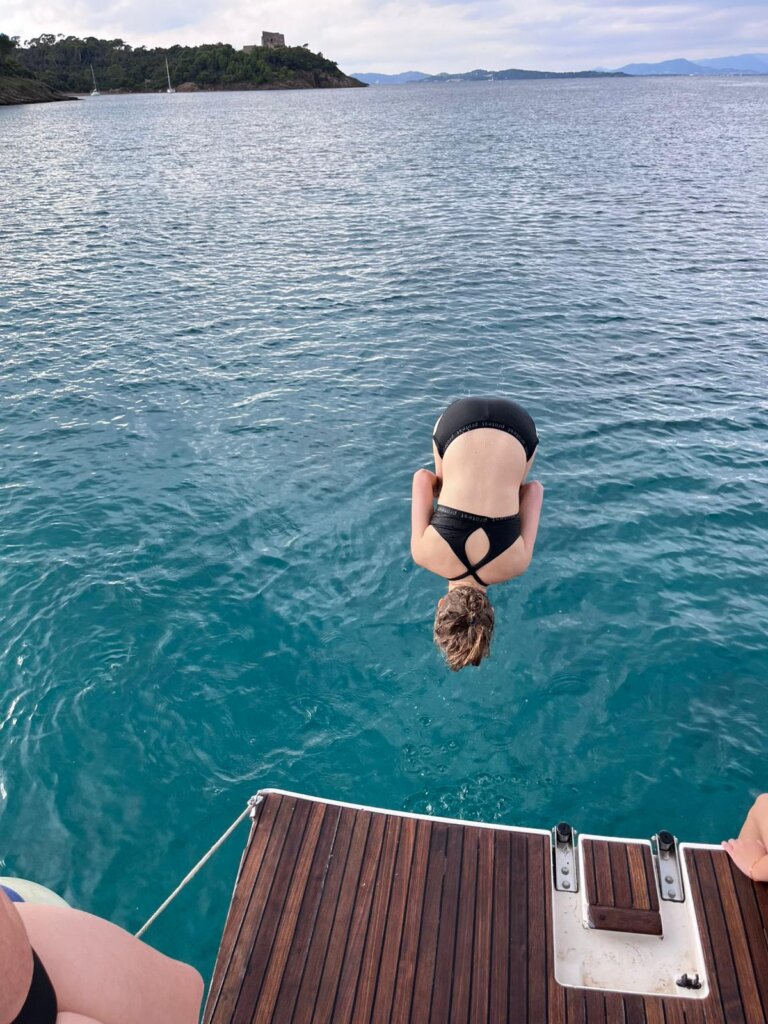 Aujourd’hui c’était chouette mais on etait tous super tristes car Jeanne a du partir à cause de ses migraines. Maintenant c’est Cléo qui s’occupe de nous, elle est très gentille mais Jeanne nous manque trop. (Petit fun fact, Cléo est tombée à l’eau habillée en sortant du petit bateau à moteur). On est partis à 10h00 du port du Lavandou pour aller à l’île de port Cros. Ensuite on a fait une marche sur l’île puis les skippers nous ont ramenés aux bateaux. Apres Cléo et Bertrand le GOAT nous ont laissés essayer le petit bateau à moteur (zodiac?). Melanie a failli foncer dans un bateau. Oscar a re-eu la frousse. Colin n’est toujours pas allé dans l’eau. Alain a beaucoup plongé et a aidé Oscar à dépasser sa peur. Charlotte a beaucoup fait de tours de bateau avec Julie et on a appris que Alice ne sait pas plonger. Noah a eu un snap d’une allemande. Jérémy a montré l’exemple à Oscar pour plonger. Ce soir dodo à l’ancre. À demain!