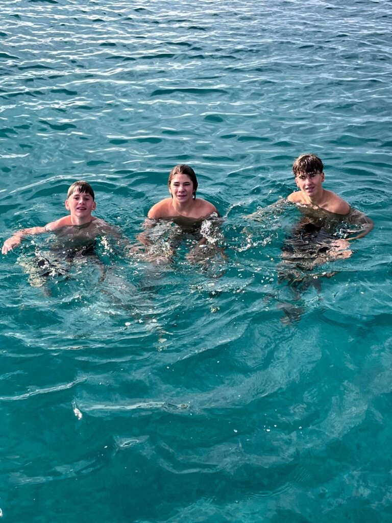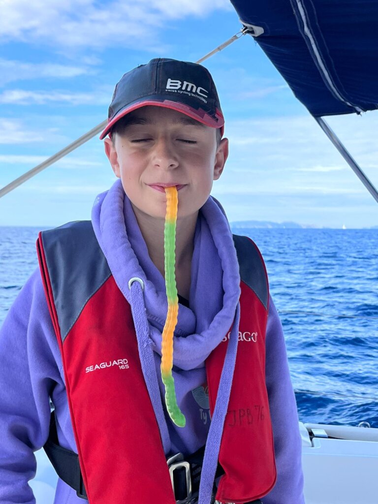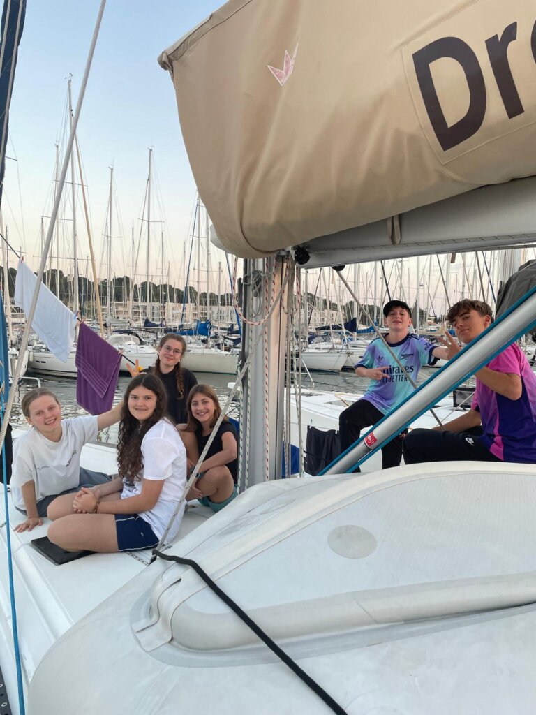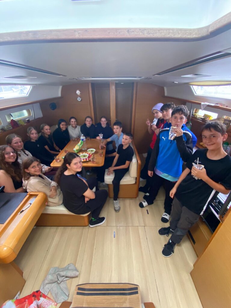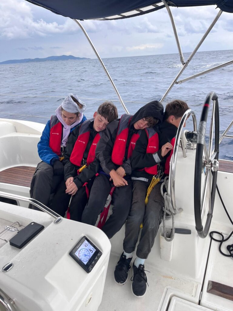 Aujourd’hui c’était chouette mais on etait tous super tristes car Jeanne a du partir à cause de ses migraines. Maintenant c’est Cléo qui s’occupe de nous, elle est très gentille mais Jeanne nous manque trop. (Petit fun fact, Cléo est tombée à l’eau habillée en sortant du petit bateau à moteur). On est partis à 10h00 du port du Lavandou pour aller à l’île de port Cros. Ensuite on a fait une marche sur l’île puis les skippers nous ont ramenés aux bateaux. Apres Cléo et Bertrand le GOAT nous ont laissés essayer le petit bateau à moteur (zodiac?). Melanie a failli foncer dans un bateau. Oscar a re-eu la frousse. Colin n’est toujours pas allé dans l’eau. Alain a beaucoup plongé et a aidé Oscar à dépasser sa peur. Charlotte a beaucoup fait de tours de bateau avec Julie et on a appris que Alice ne sait pas plonger. Noah a eu un snap d’une allemande. Jérémy a montré l’exemple à Oscar pour plonger. Ce soir dodo à l’ancre. À demain!