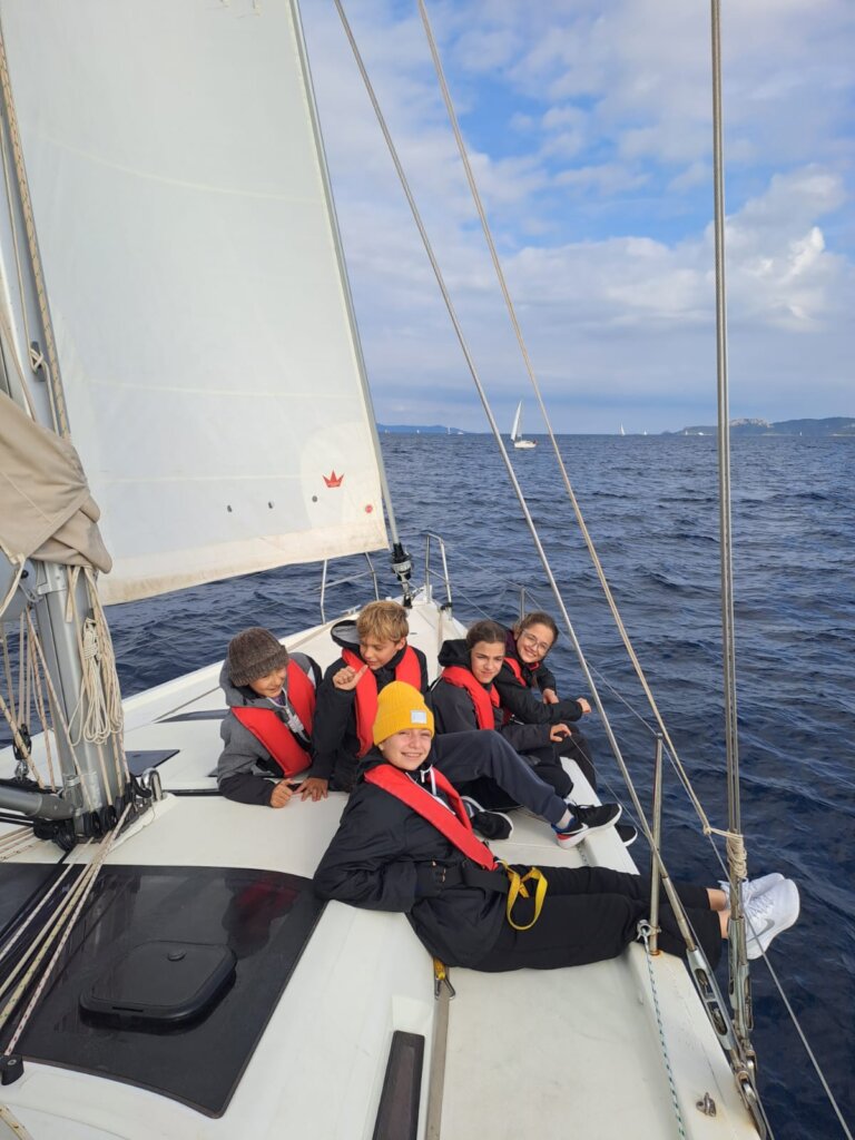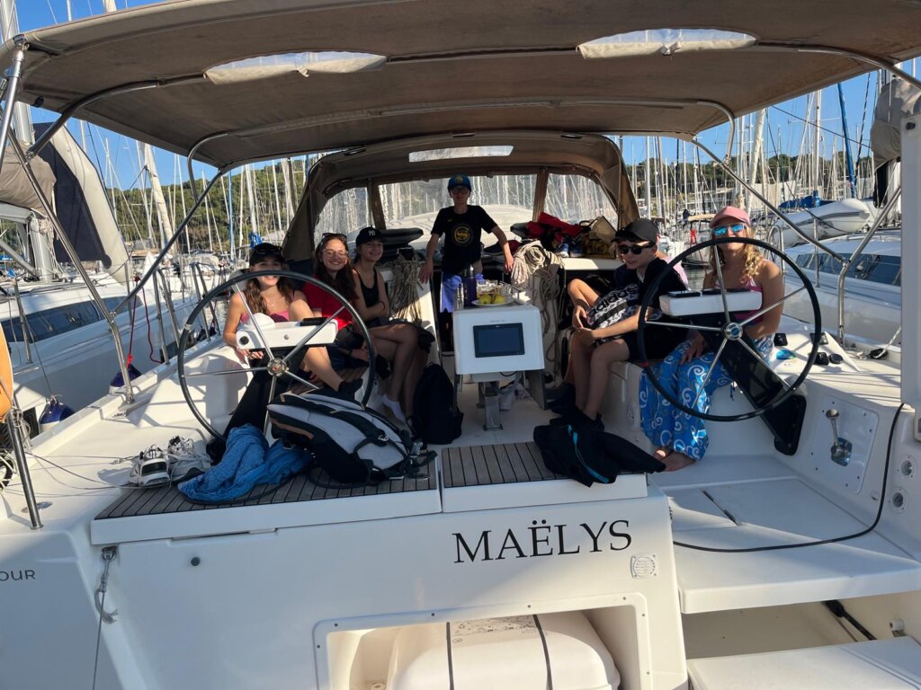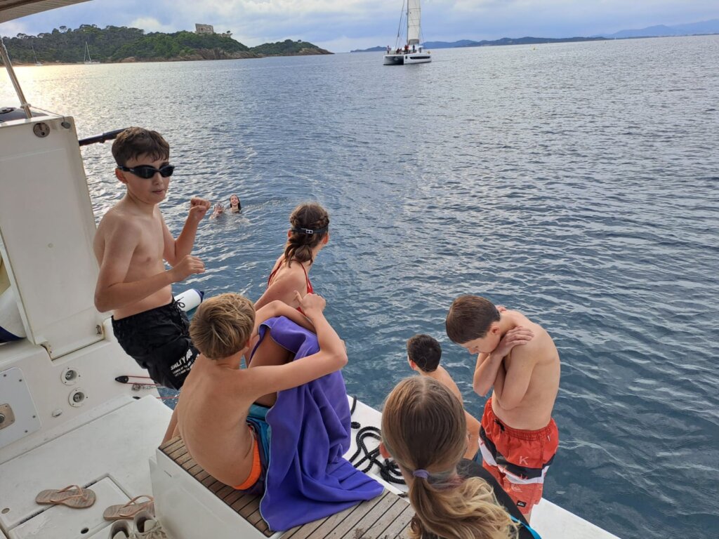 Pour le premier jour, il y a Liam et Caroline qui ont vomi et les autres ne se sentaient pas bien par moment. Après avoir planté l’ancre, on s’est tous baigné malgré qu’on ai eu de la peine à rentrer sauf Olivia B., qui est tombée dans l’eau 😂.