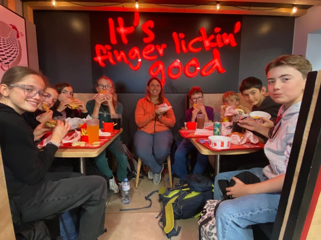 Nous avons ensuite pris un brunch vers 10h30 puis jusqu’à 13h45, certains ont joués au Skull King ou à d’autres jeux tandis que Olivia B. et Laurent ont fait une très grosse sieste 😂. Puis nous sommes partis avec tous les équipages pour faire une marche d’environ 2h (trop long 🥲). Madame Kolly nous a généreusement acheté des glaces sur le chemin du retour et maintenant Alexine, Olivia S. et Augustin coupent le saucisson 😋 !