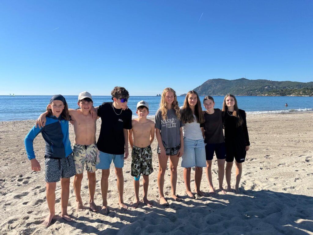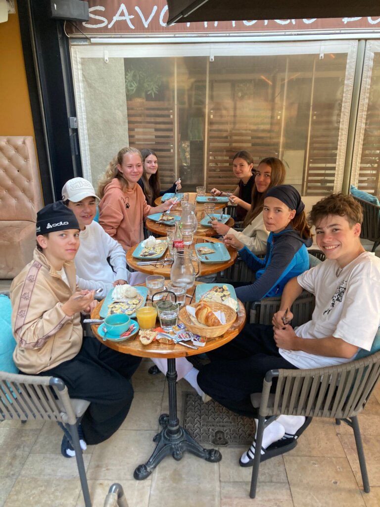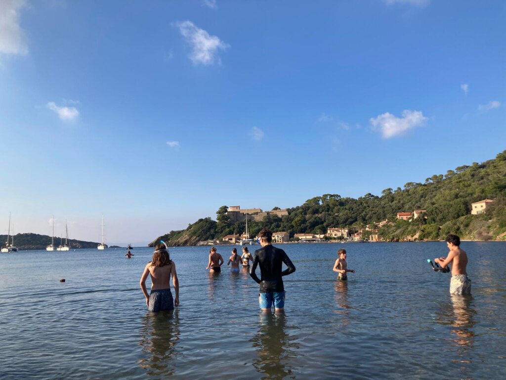 Heute morgen haben wir unser Frühstück im Hafen von Porcerolles gegessen. Dann haben wir unseren Rucksack gepackt für den Ausflug, weil wir heute nämlich nicht segeln waren, sondern eine Vélo- Wandertour gemacht haben. Als wir dann unsere halbwegs guten Vélos bekamen, fuhren wir zur Silverbeach. Dort haben wir dann gepicknickt und im klaren Wasser gebadet. Danach sind wir lange weiter gewandert um einen Leuchtturm zu besichtigen, welcher aber dann nicht zugänglich war. Wir konnten aber dann noch einen schönen Ausblickspunkt besuchen, wo man eine schöne Bucht sehen konnte. Nach der Wanderung hatten wir dann den zweiten Austausch mit den Französischsprachigen. Wir assen zusammen ein Eis und machten noch ein Spiel. Jetzt geniessen wir unsere Fajitas zum ,,z’Nacht,, und danach kommt das Boot von den Wünewiler zu uns UNO spielen.