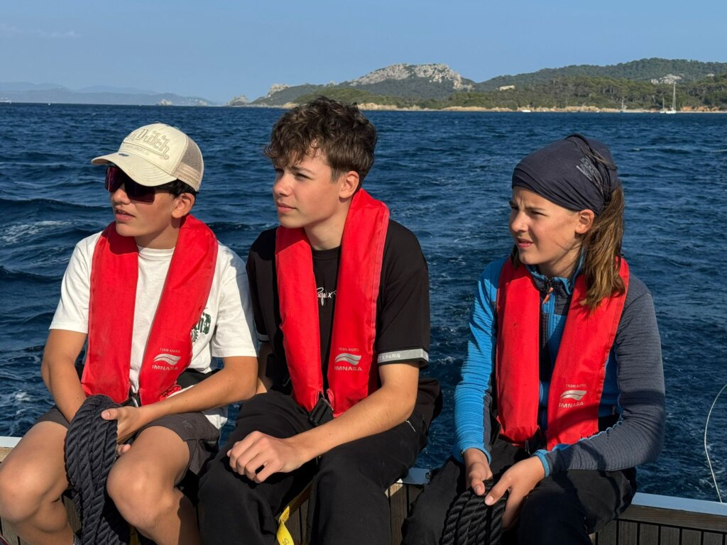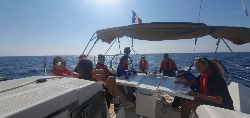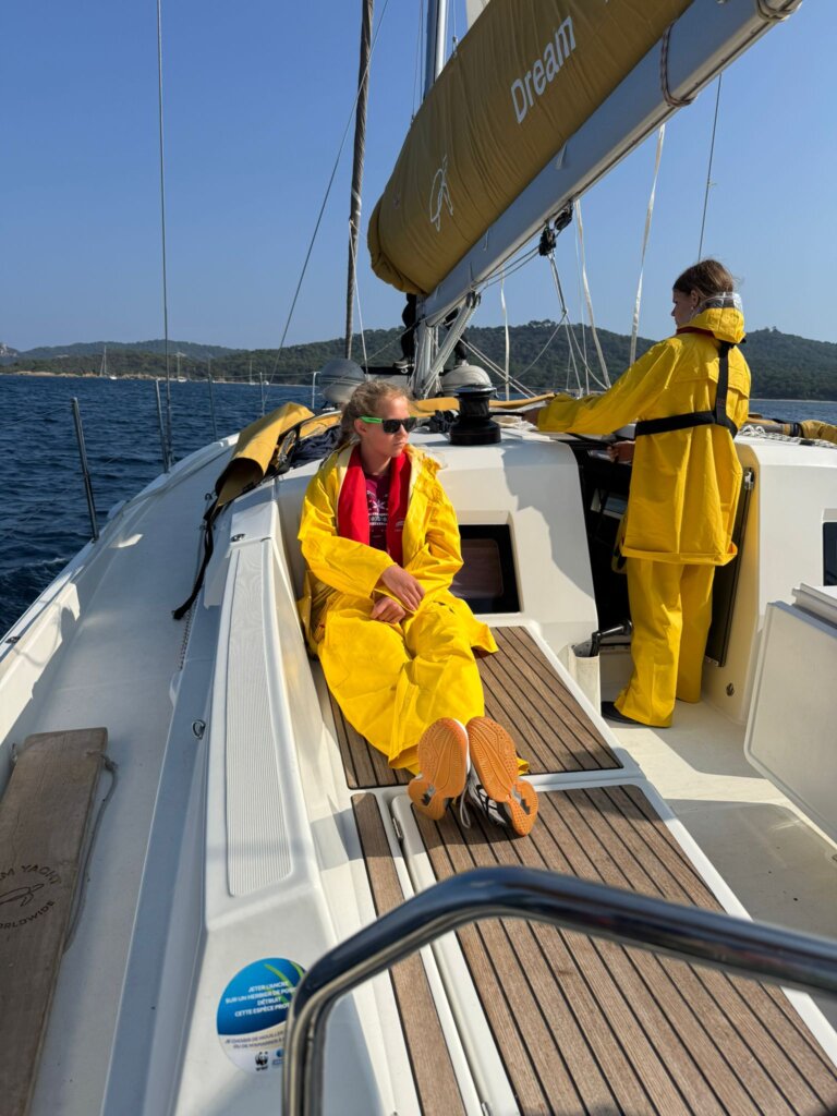 Ce matin, nous avons pris notre petit-déjeuner et nous nous sommes préparés pour la navigation. Puis, nous avons mis les voiles pour Porquerolles. En cours de route, un hélicoptère est alors arrivé et nous a demandé de faire demi-tour car entrions dans une zone d’exercice militaire. Poursuivant notre route, nous avons essayé de trouver des dauphins, mais ils refusaient de faire surface. Après avoir déjeuné dans une baie, Nora et Jul sont allés nager. Maintenant, après une douche, nous (spécialement Jul) attendons l’école de Jolimont pour l’AperH20 !
