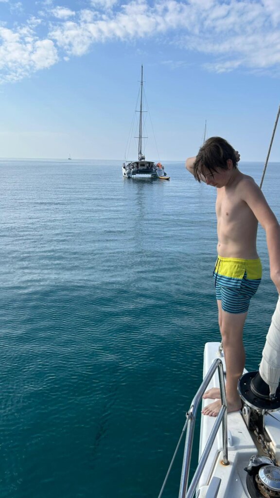 Aujourd’hui, 2ème jour. Nous avons fait le plein d’eau ensuite, nous sommes parti en mer. On a hisser les voiles puis nous avons seulement navigué avec les voiles. Nous avons naviguer dans la mer Méditerranée pendant environ 6 heure. En arrivant, nous avons pu profiter de l’eau bien salé. Plus tard, par 4 plus le skipper, avons fait un tour en bateau gonflable (avec moteur). Ici l’île est très grande et très préserver juste ~100 personnes. Habitent l’île car elle est semi-privée. Résumé c’était très fun !