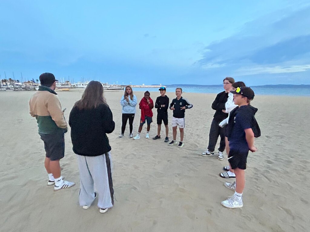 Aujourd’hui, premier jour du camp d’automne, Rêves sur mer, ce fut une rude journée, mais nos efforts portèrent leurs fruits. Nous sommes partis du CO de Sarine-Ouest vers minuit. Le chauffeur fit plusieurs pauses, où nous pûmes nous dégourdir les jambes. Ensuite, vers 8h du matin, nous sommes arrivés ici, au port de Pin-Rolland. Nous avons déposé nos sacs, et avons marché jusqu’à la plage des Sablettes. Nous avons passé cinq ou six heures sur le sable. C’était un bon moment (comme le montre les photos). Vers 15 heures, nous sommes allés à l’Intermarché le plus proche pour acheter toute la nourriture pour la semaine. Nous sommes revenus au port pour s’installer dans nos bateaux, jusqu’à ce que, vers 19 heures, les trois équipes, (cuisine, vaisselle et blog) se mirent au travail.